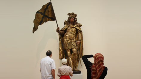 Besucherin mit Kopftuch vor einer Skulptur im Bode-Museum
